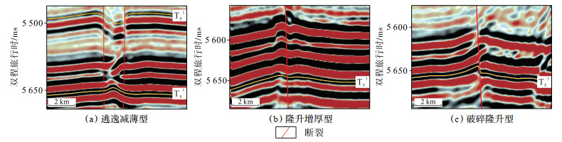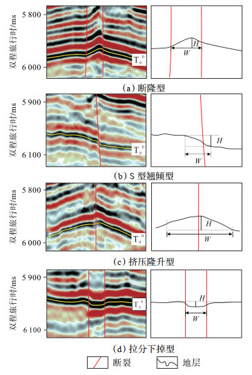 顺北5号断裂带南段T90界面地层变形特征可划分为断隆、S型翘倾、挤压隆升、拉分下掉等4种类型(图 5)。地层变形强度I越大,断裂发育位置烃源岩层变形越强,走滑断裂的通源性越好。