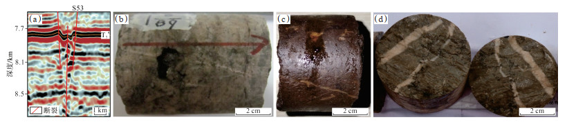 顺北地区深层碳酸盐岩油气藏赋存于奥陶系一间房组和鹰山组断控缝洞储集体中,储集空间为洞穴、孔洞和裂缝,地震上具有断裂+“串珠反射”、断裂+“杂乱反射”和断裂+“弱反射”特征[32, 35]。储集体主要为构造应力下断裂两盘相对滑动致地层破碎,受后期深部热液及流体叠加改造形成的缝洞空间。洞穴主要以断裂空腔存在于断裂核部,大小各异,钻井上表现为大段放空(> 5 m)和大体积漏失(图 7a)。孔洞为破碎或溶蚀作用形成,直径几百微米至10 cm,或密集分布或孤立发育,部分被方解石充填,部分与裂缝连接,形成缝洞系统(图 7b,7c)。裂缝是以高角度缝、斜交缝、不规则裂缝及诱导缝等形式存在,延伸长,交错发育,岩心上多见方解石充填缝和沥青充填缝(图 7d)。