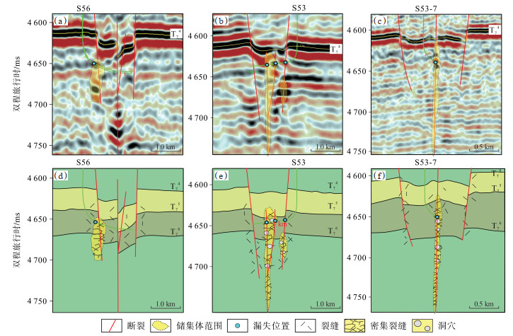 不同储集空间相互组合形成了不同的储集体发育特征,结合不同储集空间在垂向上位置分布,将顺北5号断裂带南段典型井储集体总结为3类发育特征,分别为主次裂缝型、主次缝洞型、主断缝洞型(图 8)。其中,主次裂缝型在地震剖面上西侧地堑断面为“串珠反射”和强反射,中部主断面为“弱反射”,且中部断面未发生漏失和放空,地堑断面漏失量也小,表明中部主断面和西侧地堑断面均发育裂缝(图 8a,8b),如S56井。主次缝洞型中部走滑断裂主断面和两侧地堑断面均发生漏失和放空,地震上均为“串珠反射”和强反射,表明均发育洞穴,不过中部主断面漏失量更大,缝洞更发育,规模更大,西侧或东侧地堑断面漏失量较小,放空少,主次断裂均发育缝洞,只是主断裂规模更大(图 8c,8d),如S53井、S53-1井和S57井。主断缝洞型钻井过程中,仅在中部主断面钻遇漏失和放空,两侧地堑断面不发生放空和漏失,且地震剖面上中部主断面多为“串珠反射”和强反射,两侧地堑断面多为“弱反射”,表明中部主断面发育缝洞储集体且具有一定规模,而西侧地堑断面仅发育裂缝(图 8e,8f),如S55井、S53-2井和S53-7井。