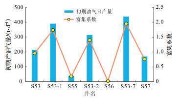 塔里木盆地顺北地区油气藏普遍具有高温常压的特征,储集体埋深普遍大于7 300 m。走滑断裂带垂向构造组合特征直接控制着油气藏分布,一间房组顶面垂向含油气高度可达430 m,但各井之间产量差异较大。顺北5号断裂带南段单井初期油气产量为5~438 t/d,单井初期产量相差近88倍,具有明显的富集差异。将初期产油气量大于200 t/d划分为高产井,100~200 t/d为中产井,小于100 t/d为低产井,因此5号断裂带南段S53,S53-1,S53-2和S53-7均为高产井,S57为中产井,S55,S56均为低产井。顺北地区油气类型主要为凝析气藏,既产油又产气,为便于对比,运用油气富集系数进行表征,富集系数E计算公式为