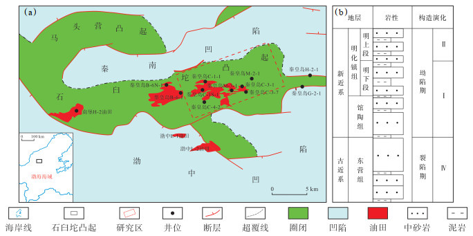 1 地质概况石臼坨凸起位于渤海海域中部,为长期继承性发育的宽缓凸起,南邻渤海海域最大的富生烃凹陷渤中凹陷,北接秦南凹陷,发育地层包括新近系馆陶组(N1g)和明化镇组(N1+2m)、古近系东营组(Ed)、中生界(Mz)和古生界(Pz),太古界(Ar)目前尚未揭示(图 1)。通过长期活动断层,凸起内古近系近源扇体与凹陷区烃源岩相连,发育背斜型汇聚脊,具有双洼双向供烃、背斜型凸起强势汇聚的特殊优势。近几年,对该凸起新近系明化镇组下段(明下段)开展岩性油气藏勘探,发现了秦皇岛B-6、南堡H-2和秦皇岛C-1S等多个亿吨级油气田[3]。研究区秦皇岛M-3构造区位于石臼坨凸起东段斜坡区,围区高部位已发现秦皇岛B-6油田、秦皇岛C-1/1南油田,发育断裂以顺向断裂为主。研究区主要含油层位为明下段,以河湖交互相沉积为主,具“泥包砂”的岩性特征,砂体厚度大、孔隙度高,平均油柱高度大,储-盖组合好,为凸起之上主力含油层系,目前区内单井平均探明石油储量约300×104 t。