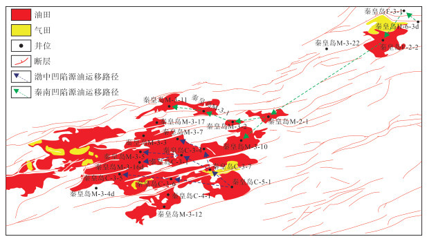 (3)秦南凹陷供烃对秦皇岛M-3区由东南向中部至西北部的油气充注,渤中凹陷供烃由东南向西北分级充注。研究区受渤中、秦南双凹陷供烃,油气沿边界大断裂向凸起运移,经馆陶组横向输导并驻留,沿馆陶组断裂再分配,垂向运移至明下段规模性聚集成藏。