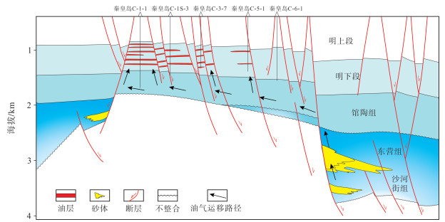 研究区石臼坨凸起秦皇岛M-3构造区受渤中凹陷和秦南凹陷供烃,油气沿凸起边界大断裂向凸起方向运移。以辫状河三角洲前缘含砾砂岩沉积为特征的馆陶组较为宽缓,油气沿馆陶组进行横向输导及驻留,研究区馆陶组断裂延伸距离长、活动强度大,对油气实现了再分配,使油气由馆陶组向上覆明下段完成规模性的油气垂向运移。明下段为河湖交互相沉积,“泥包砂”的岩性特征明显,储-盖组合好,最终油气大规模聚集成藏(图 13)