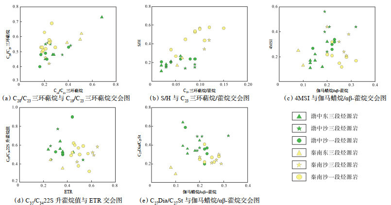 对渤海湾盆地石臼坨凸起的2个相邻凹陷秦南凹陷及渤中凹陷分别发育的3套古近系(东三段,沙一段和沙三段)烃源岩进行生物标志化合物分析。结果显示:①相较渤中凹陷,秦南凹陷的C19/ C23三环萜烷、C20/C23三环萜烷值更高,其中东三段最高,陆源有机质贡献显著,而沙河街组烃源岩陆源有机质贡献稍低。②甾烷/藿烷(S/H)、C23三环萜烷/藿烷可指示有机质母源或受微生物改造程度,渤中凹陷烃源岩的S/H、C23三环萜烷/藿烷均呈低值,而秦南凹陷沙一段参数值最高、沙三段次之。③秦南凹陷沙河街组ETR[(C28三环萜+C29三环萜)(/ C28三环萜+C29三环萜+Ts)]、伽马蜡烷/αβ-藿烷参数均呈高值,而渤中凹陷C35/C3422S升藿烷值、C27Dia/C27St值较高,综合反映秦南凹陷烃源岩沉积时期水体还原性更强、分层更为明显(图 2)。总的来说,C27Dia/C27St、升藿烷指数(C35/C3422S)、伽马蜡烷/αβ-藿烷、ETR、4MSI(4-甲基甾烷/C29甾烷)、C19/C23三环萜烷、C20/C23三环萜烷等参数可以有效区分双凹陷分层烃源岩。