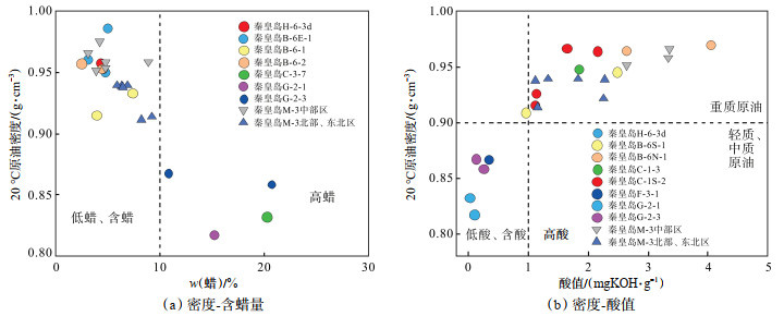 下载原图 图 3 渤海湾盆地石臼坨凸起秦皇岛M-3区新近系明下段油藏原油物性特征 Fig. 3 Physical properties of crude oil in lower Minghuazhen Formation of Neogene in Qinhuangdao M-3 area of Shijiutuo uplift, Bohai Bay Basin |