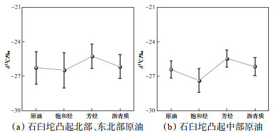 原油的碳同位素值受控于沉积环境及母源,受成熟度干扰小,是油源对比的有利指标。根据研究区原油及组分同位素分析(图 5)可知,石臼坨凸起中部原油δ13C值分布范围较小,饱和烃同位素值更小,而凸起北部、东北部原油δ13C值分布范围较大,且族组分以饱和烃为主。