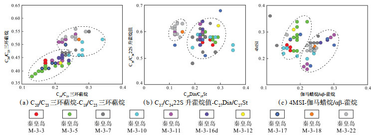 (2)秦皇岛M-3区北部、东北部油藏大多具有高C19/C23三环萜烷值、高C20/C23三环萜烷值、高C35/ C3422S升藿烷值、高伽马蜡烷/αβ-藿烷值、低C27Dia/ C27St值特征,ααα20R-C27,C28,C29规则甾烷峰值呈C27≫C28<C29的“L”型分布,指示秦南凹陷沙三段(为主)、沙一段混源供烃的特征,近源至远源(东北向西南向)沙一段输入逐渐减弱,沙三段输入逐渐增强。秦皇岛M-3区中部低C19/C23三环萜烷值、低C20/C23三环萜烷值、低—中等C35/C3422S升藿烷值、低—中等伽马蜡烷/αβ-藿烷值、高C27Dia/C27St值、高4MSI值特征,显示渤中凹陷沙河街组来源油特征,近源油藏沙一段、沙三段输入平衡,远源沙三段输入减弱。