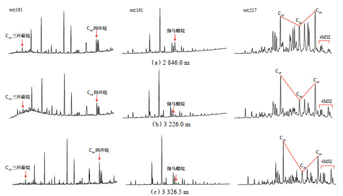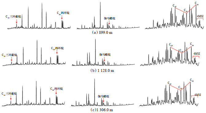 研究区中部油藏原油生物标志参数呈现低—中等C19/C23三环萜烷值、低—中等C35/C3422S升藿烷值、中等伽马蜡烷/αβ -藿烷值、高C27Dia/C27St值及高4MSI值的特征(图 6),规则甾烷分布呈C27略大于C29的“V”或“L”型,显示出渤中凹陷沙河街组来源油特征。由研究区原油饱和烃质量色谱图(图 8)可知,近源油藏(如秦皇岛C-3区)从深层到浅层(明下段Ⅲ油组—0油组),伽马蜡烷值略微增强、4MSI值增强,而远源油伽马蜡烷值不变,4MSI值降低。综上分析可知,研究区中部渤中凹陷来源油近源为沙一段、沙三段相对平衡输入,而远源以沙一段输入为主,沙三段输入较少。