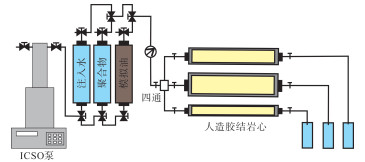 利用模拟实际油层特点的并联非均质人造岩心模型开展室内驱油实验(图 1),研究聚驱前后油层渗流能力的变化特点,具体实验流程为:水驱至含水率98.0% 以上并至注入压力稳定;注入0.7 PV中分子量普通聚合物溶液,聚合物溶液采用清水配制,浓度为1 000 mg/L;后续水驱至含水率98.0% 以上并至注入压力稳定;实验全程采取恒速注入,根据现场实际注入速度折算实验注入速度为1.2 mL/min。