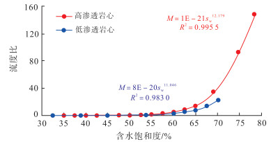 根据流度比定义可知,流度比是油水相相对渗透率比值与油水相黏度比值的函数[式(1)],对于某一确定的注水油藏,油水相黏度比值可看作固定值,则流度比可看作油水相相对渗透率比值的函数。根据大庆长垣聚驱后不同渗透率岩心特征相渗曲线可知,水相渗透率、油相渗透率均与含水饱和度具有较强的相关性,利用特征相渗曲线可以回归出不同渗透率岩心油相渗透率、水相渗透率与含水饱和度的关系公式,将不同渗透率岩心油相渗透率、水相渗透率与含水饱和度的关系式代入流度比公式,得出不同渗透率岩心流度比与含水饱和度的关系式[式(2)、式(3)]。