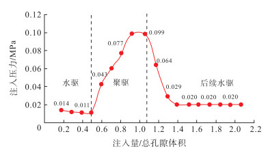 下载原图 图 2 非均质人造岩心模型驱油实验注入压力曲线 Fig. 2 Injection pressure curve of oil displacement experiment for heterogeneous artificial core model |