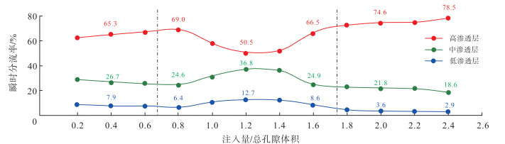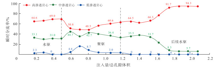 分流率为岩心单位厚度、单位时间内的相对产液量,该指标可表征不同渗透率岩心的渗流能力。由非均质人造岩心模型驱油实验分流率曲线(图 3)可看出,聚驱后不同渗透率岩心的分流率变化特征存在较大差异。水驱阶段:高渗透率岩心分流率略有上升,水驱末期瞬时分流率为69.0%;中渗透率岩心分流率基本保持稳定,水驱末期瞬时分流率为31.0%;低渗透率岩心分流率略有下降,水驱末期逐渐失去渗流能力。聚驱阶段:高渗透率岩心分流率先大幅度下降,最低降至48.5%,后逐步上升,聚驱末期达到63.2%;中渗透率岩心分流率具有先上升后下降的变化趋势,最高升至44.7%,聚驱末期为33.2%;低渗透率岩心分流率变化趋势与中渗透率岩心类似,最高升至15.9%,聚驱末期为3.6%。后续水驱阶段:高渗透率岩心分流率快速上升,最终达到94.3%,较水驱末期增加25.3%;中低渗透率岩心分流率大幅度下降,最终中渗透率岩心瞬时分流率降至5.7%、低渗透率岩心失去渗流能力。非均质人造岩心模型驱油实验结果表明,聚驱后高渗透率油层岩心与中、低渗透率岩心的渗流能力差距进一步拉大。