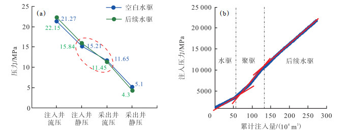 1.2.1 区块整体渗流能力变化特征绘制A区块空白水驱及后续水驱阶段注采大压差曲线,后续水驱阶段注采井间静压差与空白水驱阶段相比明显变大,驱替压力梯度由0.028 MPa/m升高至0.035 MPa/m(图 4a)。绘制A区块全过程霍尔曲线,后续水驱阶段斜率明显大于水驱阶段(图 4b),后续水驱阶段油层渗流阻力明显高于水驱阶段。A区块注采大压差曲线及霍尔曲线变化特征表明,聚驱后油层渗流阻力明显高于水驱阶段,聚驱后油层渗流阻力增大、整体渗流能力下降。
