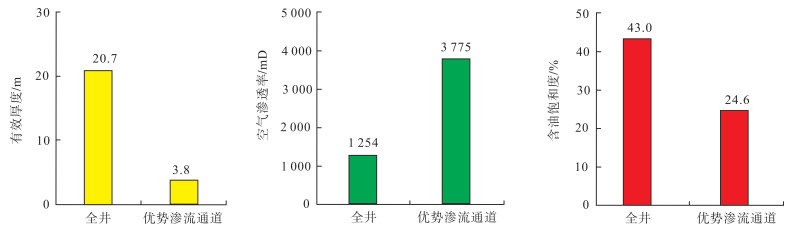 利用上述方法统计分析大庆长垣41口聚驱后取心井,结果表明,有31口井发育优势渗流通道,优势渗流通道主要发育在葡Ⅰ2、葡Ⅰ3单元底部,以中砂岩、细砂岩为主。优势渗流通道平均厚度为3.8 m,占全井厚度的18.4%,平均空气渗透率达3 775 mD,为全井平均值的3.01倍,优势渗流通道平均含油饱和度为24.6%,较全井平均值低18.4%(图 6)。按照优势渗流通道厚度占比、孔隙度及含油饱和度计算优势渗流通道部位剩余储量仅占全井剩余储量的10.9%。