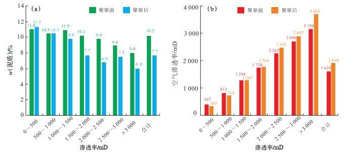 3.1 聚驱前后高、低渗透率油层渗透率级差进一步拉大统计大庆长垣74口取心井综合水洗数据,其中聚驱前取心井33口、聚驱后取心井41口,对比聚驱前后不同渗透率油层的渗透率变化情况。结果表明,聚驱后油层经历了水驱、聚驱及后续水驱的长期冲刷,整体上泥质质量分数由10.2% 下降至7.7%,但是不同渗透率岩心的泥质含量变化存在明显差异,高渗透率岩心聚驱后泥质含量明显减少,低渗透率岩心由于喉道半径小、孔隙结构复杂,冲刷运移的黏土矿物易于滞留在低渗透率岩心喉道处,导致低渗透率岩心泥质含量保持不变或略有增加(图 7a)。聚驱后油层整体渗透率大幅度升高,平均空气渗透率由1 628 mD增加至1 930 mD,但由于聚驱后油层高、低渗透率岩心泥质含量的差异变化,导致聚驱后高、低渗透率岩心的渗透率也呈现差异变化,低渗透率岩心的渗透率保持不变或略有降低、高渗透率岩心的渗透率大幅度上升,平均渗透率级差由4.4增加至5.6,高、低渗透率岩心的渗透率级差进一步拉大(图 7b)。