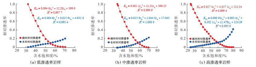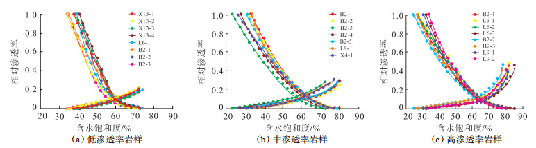 下载原图 图 9 大庆长垣聚驱后不同渗透率岩心相渗曲线 Fig. 9 Relative permeability curves of cores with different permeability after polymer flooding ofDaqing placanticline |