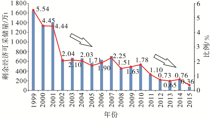 1 胜利油田新增探明储量SEC评估现状 1.1 历年评估结果从图 1可以看出,胜利油田新增探明储量SEC评估结果整体呈台阶式下降趋势,大体可以分为3个阶段:第1个阶段(1999—2001年),胜利油田新增探明储量SEC证实储量评估结果较高,年均评估证实储量为1 469万t,占当年胜利油田所有上市储量总评估结果的平均比例为4.81%;第2个阶段(2002—2010年),评估结果大幅下降,年均评估证实储量597万t,平均比例为1.81%,比第1个阶段下降了59%;第3个阶段(2011—2015年),年均评估证实储量为203万t,平均比例0.72%,比第2个阶段又下降了66%。新增探明储量对当年SEC评估结果的贡献率越来越低,从而增加了当年储量替代率完成的难度。