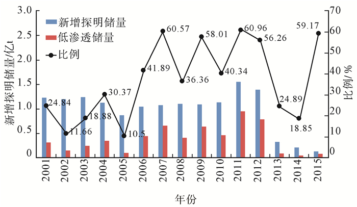下载eps/tif图 图 2 低渗透油藏储量占当年新增探明储量比例 Fig. 2 The proportion of reserves of low-permeability reservoirs to new-added proved reserves in the same year |