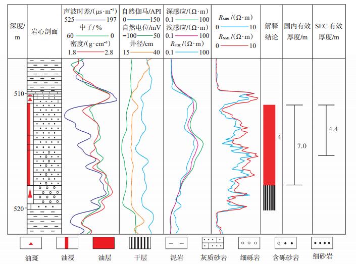 有效厚度标准界限的解释层,必须有测试资料证实,对低含油饱和度解释层,若无测试资料证实出油,则不能确定为有效厚度[15]。以春风油田某井为例,4号油层井段为511.0~520.2 m,国内确定有效厚度为7.0 m,SEC则认为该井段电性变差,未试油,不能算作证实储量,确定有效厚度为4.4 m(图 4)。