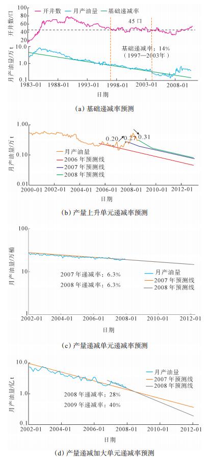 对于递减率的选取,国内一般选取生产稳定段的综合递减率,取值往往高于外方。按照SEC准则,外方会首先选取井数稳定、没有大调整措施、产量递减规律明显的递减段的递减率作为评价单元的基础递减率[图 6(a)] [18]。对于产量上升单元,先是按照新井的递减率或者新老井递减率的加权值给一段时间的大递减(时间为1~2 a),然后按基础递减率预测[图 6(b)];对于产量递减稳定单元,则直接按基础递减率预测[图 6(c)];对于产量递减加大单元,按加大后的递减率进行预测[图 6(d)]。对于新增探明区块,由于新井初期递减率高,会先给一段时间的大递减(时间一般为1~2 a),然后再按基础递减率预测。对于评估结果的合理性,可用平均单井增加可采储量值进行验证。以春风油田某稠油油藏区块为例,国内吞吐开发阶段递减率取值为15%,转蒸汽驱开发后,递减率取值为10%,外方评价证实已开发储量时按照实际生产曲线,递减率取值为30%,这样计算的剩余经济可采储量比国内减少了47%。