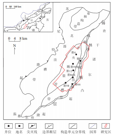 1 区域地质概况赛汉塔拉凹陷位于二连盆地腾格尔坳陷的西部,其南北两端为北东走向,中部为北北东走向,总体呈舒缓的“S”形。凹陷西北部是苏尼特隆起,南部是温都尔庙隆起,东邻查干诺尔凸起,东西宽约23 km,南北长约100 km,总面积为2 300 km2,基底埋深大于5 000 m,是腾格尔坳陷内最大的凹陷(图 1)[14]。