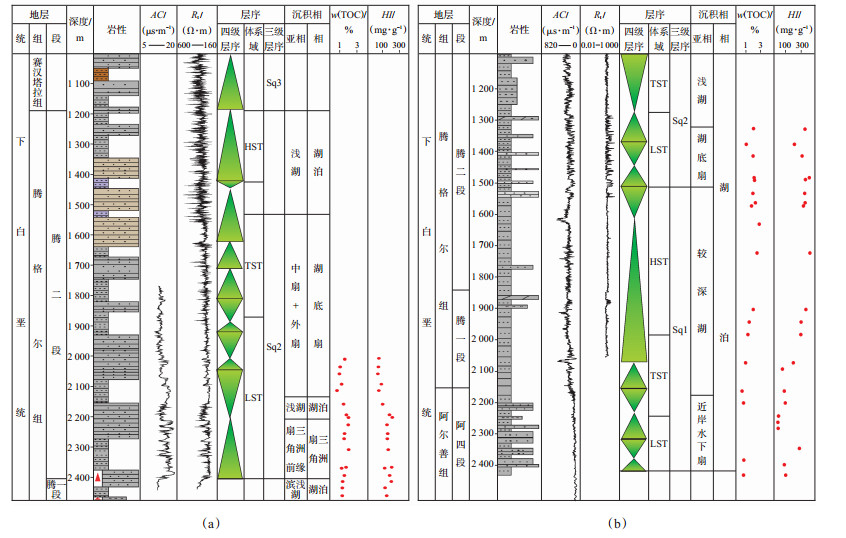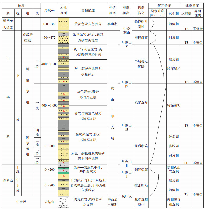 赛汉塔拉凹陷经历了断陷成湖、扩张深陷、萎缩消亡的断陷湖盆的完整发育过程[17-19],自下而上依次发育古生界、侏罗系、白垩系、古近系、新近系及第四系,其中下白垩统巴彦花群自下而上划分为阿尔善组、腾格尔组一段、腾格尔组二段及赛汉塔拉组(图 2)。阿尔善组和腾一段代表了湖盆发育的全盛时期,从阿四段到腾一段为连续沉积,是一个完整的水进体系,发育了赛汉塔拉凹陷2套重要的烃源岩,即阿尔善组烃源岩、腾一段烃源岩;腾二段早期凹陷稳定沉降,晚期缓慢抬升,湖盆逐渐消亡,沉积了区内第3套富含有机质的湖相烃源岩,即腾二段烃源岩。这3套烃源岩为赛汉塔拉凹陷提供了丰富的油源[20]。