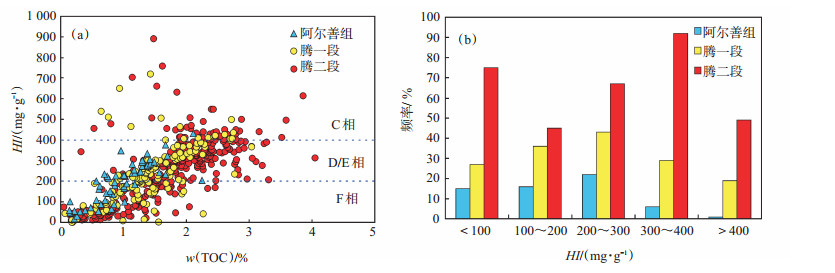 2.2 分布特征统计、整理赛汉塔拉凹陷540余个岩石热解数据表明,烃源岩TOC含量与HI相关性很好,当TOC质量分数小于1%时,HI随TOC含量的增大而缓慢增大;当TOC质量分数为1%~2%时,HI快速增大;当TOC质量分数大于2%时,HI基本保持不变,据此将烃源岩有机相划分为C相、D/E相及F相(图 3)。