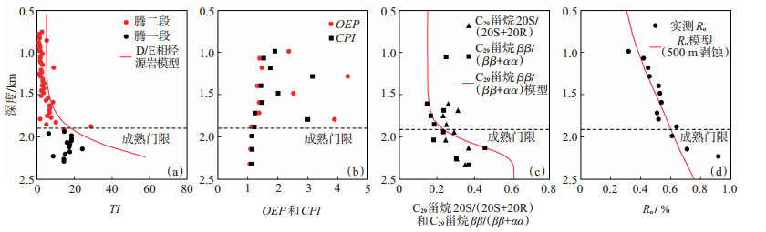 下载eps/tif图 图 5 赛97井深度与岩石热解参数(a)、烷烃参数(b)、生物标志物参数(c)及镜质体反射率(d)的关系 Fig. 5 Parameters of Rock-Eval (a), alkane (b), biomarker (c) and vitrinite reflectance (d) vary with depth in Sai-97 well |