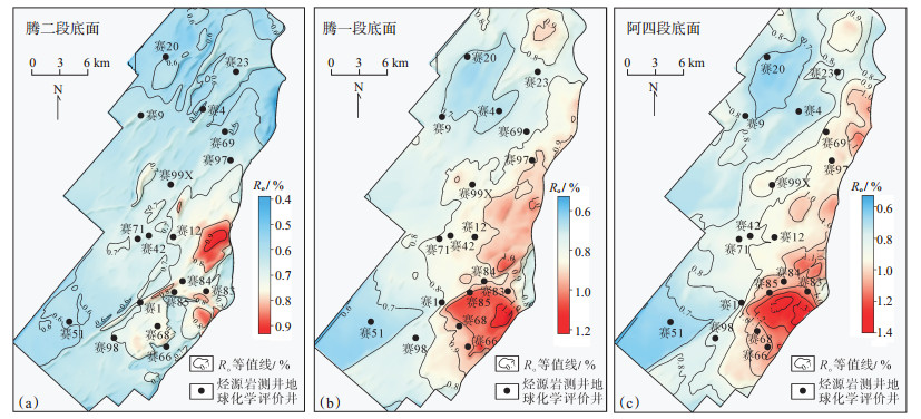 综合应用岩石热解参数(TI),结合烷烃参数(OEP和CPI)、生物标志物参数[C29甾烷20S/(20S +20R)和C29甾烷ββ(/ ββ +αα)]及镜质体反射率(Ro),标定赛97井烃源岩的成熟度,其门限深度为1 900 m(图 5)。利用生烃动力学模型分析软件(Kinex)对赛97井烃源岩(有机相为D/E)进行生烃曲线的拟合,结果显示,当古地温梯度为40 ℃/km、剥蚀厚度为500 m时,曲线与岩石热解参数、生物标志物参数和镜质体反射率拟合很好。在赛汉塔拉凹陷,由于构造背景的差异,不同区域的剥蚀厚度有所不同,通过对典型井剥蚀厚度的恢复和有机质成熟度的标定,实现了对整个凹陷埋藏热演化史的恢复,从而确定了主力烃源岩有机质成熟度的分布(图 6)。腾二段烃源岩处于未成熟—低成熟阶段,Ro为0.40%~0.85%,仅在赛东洼槽(参见图 1)局部Ro达到0.70%~0.85%。腾一段烃源岩基本进入成熟阶段,Ro为0.7%~1.2%,赛东洼槽有机质成熟度整体较高,Ro为0.9%~1.2%。阿尔善组烃源岩有机质成熟度相对更高,Ro为0.8%~1.4%。
