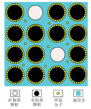 基质岩块放大后的内部结构如图 2所示。大量的有机质和少量的矿物质 (灰分) 构成了基质岩块的骨架颗粒,粒间孔隙充满了地层水,水中溶解了少量的甲烷分子,有机质颗粒表面吸附了大量甲烷分子,吸附甲烷与水中溶解甲烷处于平衡状态。因为矿物质颗粒表面的极性较强,因而只能吸附极性较强的水分子,不能吸附极性较弱的甲烷分子。吸附甲烷是煤层气的主要组成部分,也是主要的开采对象。溶解甲烷数量极少,无开采价值。煤层气主要以吸附形式赋存于基质岩块中。