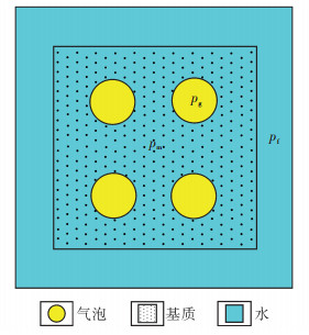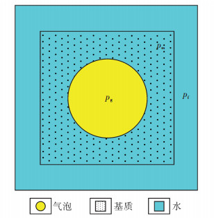 煤岩为双重介质,因而有2个压力系统,包括割理压力pf和基质孔隙压力pm。这2个压力系统在原始条件下处于平衡状态,皆为原始地层压力pi。煤层气井投产后,由于割理中的水被率先采出,因此割理压力下降较早,且较快 (图 4)。割理压力下降后,割理与基质之间便产生了压力差,基质孔隙中的水在压力差的驱动下开始向割理流动,水流出后,基质孔隙压力开始下降,当基质孔隙压力低于水的饱和压力之后,溶解气开始从水中脱出,煤岩中的吸附气也开始解吸。煤层气的解吸压力,实际上就是地层水的饱和压力或泡点压力。刚刚解吸出来的少量甲烷气体,只能以气泡的形式分散在水中,由于气体的饱和程度较低,没有形成连续相,因此还不能流动 (图 5)。