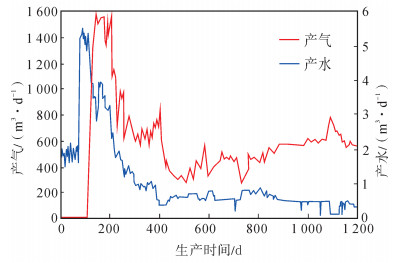 (1) 鄂尔多斯盆地CB102井从800 m深的煤层中开采煤层气,煤层厚度为9.6 m,投产初期一直处于排水状态,排水生产200 d左右时突然见气,且产气量突然升高至1 000~1 200 m3/d,稳定生产一段时间之后才出现产量递减 (图 8)。