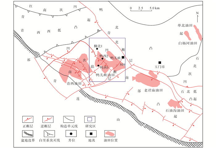 1 区域地质背景酒泉盆地处于阿尔金地块、阿拉善地块与北祁连造山带三者的结合部位,面积约2.2万km2,目前已发现老君庙、鸭儿峡、石油沟、青西、白杨河及单北等6个油田,石油探明储量及潜在资源量主要集中在青西坳陷及老君庙推覆带。酒泉盆地主要经历了古生代褶皱基底—中生代裂谷断陷—新生代前陆坳陷的演化过程,其中,中、新生代主要经历了早白垩世拉张断陷期和古近纪挤压坳陷期等2个构造旋回,沉积盖层具有断、坳叠置的双层结构特征[12]。早白垩世是盆地重要的发展演化时期,此时期在右旋扭动大背景下,盆地局部受张应力作用,形成了一系列北东、北北东张扭性断裂及断陷湖盆,断陷湖盆中沉积了巨厚的烃源岩及储集层、盖层,具备良好的油气储集及保存能力。