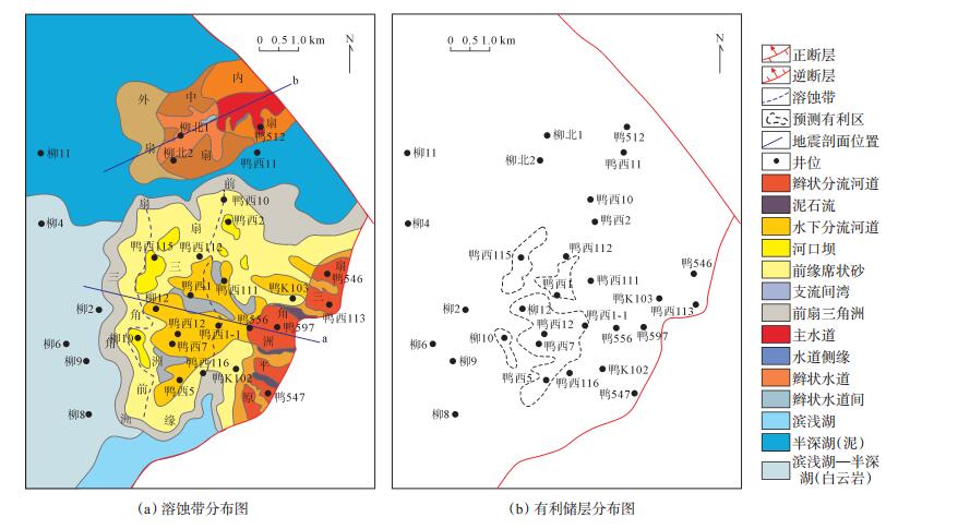 通过研究区长石含量、岩屑与杂基含量、埋深分布及孔隙度等因素,结合构造因素综合分析,预测出有利溶蚀带分布范围[图 11(a)]。从图 11(a)中可以看出,溶蚀区东以鸭西10—鸭西112—鸭西1-1—鸭西116井为界,西以鸭西115—柳12—柳10井为界,主要分布于扇三角洲前缘向湖泊一侧,主要沉积微相为水下分流河道及河口沙坝,其次是前缘席状砂,而近物源一侧虽同属于水下分流河道及河口沙坝等微相,但因距物源近、分选差、泥质含量高等导致溶蚀作用不明显。