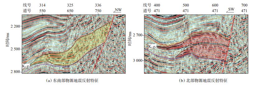 从地震反射特征来看,东南部及北部物源均呈楔状体形态,垂向上表现为顶凸底平的丘状体,但东南部物源较北部物源延伸更远,东南部物源根部表现为杂乱反射,向湖方向逐渐变为较强的连续反射,北部物源则以杂乱反射为主,向湖方向与湖交界处出现少量连续反射,反映北部物源堆积更快,分选更差的特征(图 2),钻井资料显示,北部物源沉积体混杂堆积,结构成熟度明显较东南物源沉积体更差,与地震反射特征相符合。