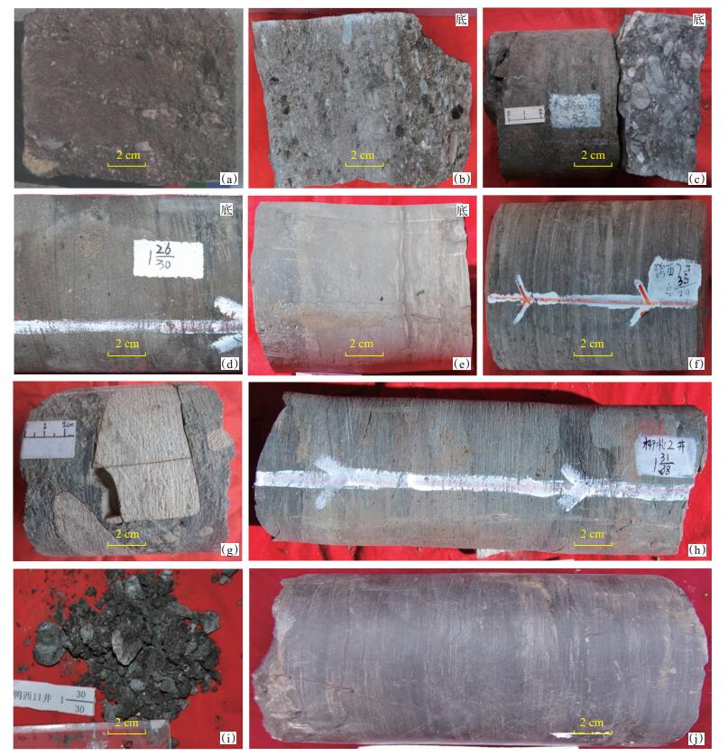 下载eps/tif图 图 3 鸭儿峡地区下沟组K1g13沉积微相岩心特征 Fig. 3 The core features of microfacies of K1g13 of Cretaceous Xiagou Formation in Ya'erxia area (a)鸭547井,3 471.30 m,棕红色细砾岩,见3组正粒序,辫状分流河道;(b)鸭西1-1井,4 071.70 m,灰色细砾岩,见正粒序,水下分流河道;(c)鸭西1井,4 081.25 m,灰色中砾岩,正粒序,发育交错层理,水下分流河道;(d)柳10井,4 463.56 m,灰色细砂岩,浪成沙纹层理,河口沙坝;(e)鸭西116井,4 157.56 m,浅灰色粉砂岩,底部见波纹层理,前缘席状砂;(f)鸭西7井,4 335.86 m,灰黑色粉砂质泥岩,见水平层理,支流间湾;(g)柳北1井,3 830.97 m,黑灰色粗砾岩,磨圆、分选均差,主水道;(h)柳北2井,4 239.62 m,灰色含砾泥质粉砂岩,水道侧缘;(i)鸭西11井,3 846.50 m,黑色泥岩,滨浅湖泥岩;(j)柳9井,4 900.59 m,深灰色白云质泥岩,见水平层理,滨浅湖 |