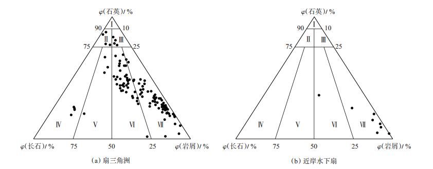 4 储层特征 4.1 岩石学特征扇三角洲储层岩性较为复杂,主要为灰色、棕红色中细砂岩、杂色砂砾岩构成。据9口井412个薄片分析数据统计表明,扇三角洲碎屑岩储层碎屑组分中石英体积分数一般为21.5%~73.6%,平均为43.2%,长石体积分数一般为1.2%~66.2%,平均为15.5%,岩屑体积分数为6.9%~74.4%,平均为40.1%,主要为长石岩屑砂岩及岩屑砂岩,其次为少量岩屑长石砂岩、长石砂岩[图 5(a)]。成分成熟度较低,分选以中等为主。砂岩颗粒磨圆度以次棱角—次圆状为主,结构成熟度低—中等。砂岩储层中的岩屑成分以灰色泥质板岩、千枚岩等塑性岩屑组合为主。泥质杂基体积分数一般小于5%,个别可达到20%。胶结物成分以泥(粉)晶白云石为主,其次为方沸石、石英次生加大及硬石膏。