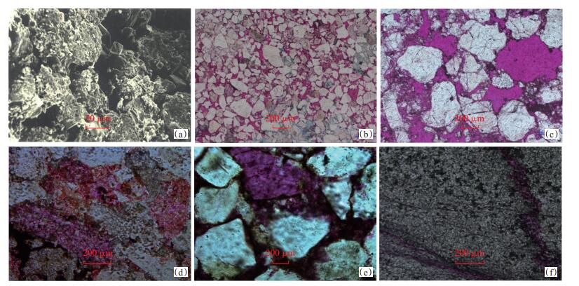 辫状分流河道微相属于牵引流成因,其内发育牵引流砂砾岩和砂岩,但由于距物源较近,结构成熟度较低,导致泥质含量较高,原生孔隙较少,孔隙类型以残余粒间孔为主[参见图 6(a)],体积分数一般小于4%,孔喉结构一般,物性较差,属于较差储层;泥石流微相属于重力流沉积,通常为泥、砂、砾混杂堆积,结构成熟度低,物性差,属于非储层;漫滩沉积微相主要为泥岩及粉砂岩沉积,统计显示孔隙度、渗透率均较低,为非储层;水下分流河道与河口沙坝主要发育砂砾岩与砂岩,由于经历较长距离搬运,分选与磨圆均较好,泥质含量降低,以后期溶蚀孔[参见图 6(c)~(e)]为主,见少量残余原生粒间孔[参见图 6(b)],孔隙连通性相对较好。压汞实验表明,其孔喉分选性较好,排驱压力小,毛管半径大,物性最佳,为较好储层;前缘席状砂微相内发育细砂岩与粉砂岩,粒度细,虽砂体结构成熟度较高,但岩性偏致密,原生孔隙相对较少,砂体薄,常与泥岩互层分布,为较差储层;支流间湾及前三角洲泥微相以泥岩为主,属于非储层。