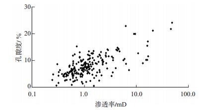 4.3 储层物性特征通过对10口井212块样品岩心物性数据分析表明,研究区下沟组K1g13扇三角洲孔隙度主要为0.66%~23.81%,平均为6.95%,渗透率为0.083~ 224.300 mD,平均为7.601 mD,属于特低孔、特低渗型储层。统计数据表明,目的层孔隙度与渗透率相关性(R)较好,呈指数关系(图 7),R2= 0.67,表明储层流体的运移通道主要受孔隙的影响,为孔隙型储层。通过3口井44块样品物性分析数据表明,研究区近岸水下扇目的层孔隙度主要为0.86%~ 9.87%,平均3.95%,渗透率为0.052~6.625 mD,平均为1.39 mD,孔、渗均明显低于扇三角洲。