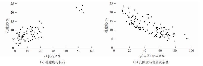 下载eps/tif图 图 8 鸭儿峡地区白垩系下沟组K1g13储层孔隙度与岩石成分关系图 Fig. 8 Relationship between porosity and rock composition of K1g13 of Cretaceous Xiagou Formation in Ya'erxia area |