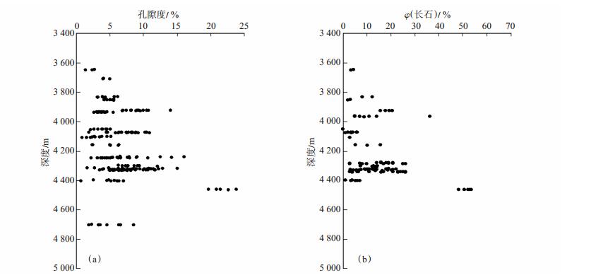 5.2 溶蚀带分布的影响通过岩心、薄片及扫描电镜等资料分析,发现研究区下沟组K1g13溶蚀作用明显,溶蚀孔洞是其主要储集空间类型。次生孔隙主要表现为长石、岩屑及碳酸盐岩胶结物的部分溶蚀甚至全部溶蚀,其中主要为长石溶蚀导致,碳酸盐岩胶结物及岩屑溶蚀孔对储层物性影响相对较小。分析表明,孔隙度与长石具有较好的相关性[图 8(a)],呈线性关系,R2=0.78,表明长石为主要溶蚀介质,其含量分布将在很大程度上影响溶蚀孔隙的分布范围;岩屑及杂基是研究区目的层主要岩石成分,体积分数最高可达90.2%,二者不易与有机酸反应,在一定程度上抑制了溶蚀作用的进行,从岩屑及杂基含量与孔隙度关系图[图 8(b)]可以看出,孔隙度与岩屑含量呈明显的负相关关系,R2=0.657。这就表明,岩屑与杂基含量也是影响溶蚀作用的重要因素之一。统计显示,次生孔隙带在垂向上主要分布于埋深3 900~ 4 500 m[图 9(a)],对应有机质成熟阶段(0.6%<Ro<0.9%),也恰与研究区生烃门限深度(4 000 m)相匹配[20],此时有机质处于大量生烃排酸阶段,且该深度段对应长石含量高值段[图 9(b)],大量有机酸与长石作用是造成强烈溶蚀的重要原因。