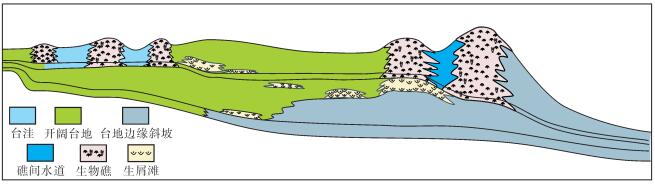 下载eps/tif图 图 2 礁滩相储层沉积模式 Fig. 2 Sedimentary model of reef flat reservoirs |