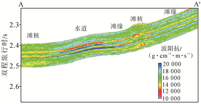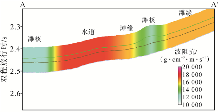 在沉积微相边界的控制下,用平均速度对各沉积微相进行充填,从而建立反演初始模型(图 7)。与常规建模方法相比,相控平均速度充填建模保持了基本的沉积背景,能够清晰刻画沉积微相边界。采用有色反演得到相对波阻抗数据体,将相控初始模型与有色反演得到的相对波阻抗进行相加,便能获得绝对波阻抗数据体(图 8)。与常规反演相比,相控平均速度充填建模和有色反演的有机结合所获得的绝对波阻抗反演结果与研究区的地质认识吻合度更高(参见图 6)。
