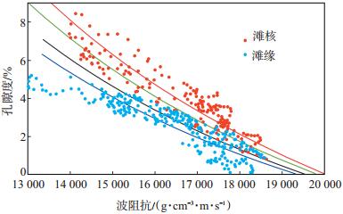 以川东南某区块为例,利用改进后的Wyllie平均时间方程[17]即Domenico方程[18],分别拟合滩核微相和滩缘微相的波阻抗(或速度)与孔隙度之间的关系式