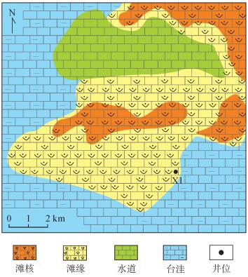生屑滩相储层预测的关键是物性预测。敬朋贵[6]2007年提出了三步法地震反演,该方法具体操作步骤如下:首先对地震叠后数据体做稀疏脉冲波阻抗反演;然后以波阻抗反演结果为约束进行岩性随机反演得到伽马体,并通过设立伽马门槛值得到“储层体”,在“储层体”中进一步拟合出波阻抗和孔隙度之间的关系式;最后根据波阻抗和孔隙度之间的关系式,再次进行随机反演,预测储层孔隙度。三步法反演的缺陷在于,随机反演算法只在井多的开发区效果较好,在井少的低勘探区并不适用。此外,生屑滩相储层孔隙度与波阻抗(或纵波速度)之间一般呈负相关,这种关系受岩性干扰比较大,如滩核生屑灰岩高孔隙储层和台洼泥灰岩非储层均呈现出低波阻抗的特征。虽然三步法中的岩性伽马反演可以部分排除岩性的影响,但三步法对岩性反演结果精度的要求较高,并且该方法难以区分复杂岩性。与三步法地震反演相比,沉积微相分析技术在复杂岩性预测方面具有其独特优势,这是因为,通过实施储层级别的沉积微相分析,获得垂向上尺度和储层级别相匹配的沉积微相信息,就可以将生屑滩沉积微相与岩性一一对应起来,再在有利相带内确定波阻抗和孔隙度之间的关系,将反演出的波阻抗体分相带实施波阻抗-孔隙度转换,便可实现少井地区生屑滩相储层相控孔隙度预测。