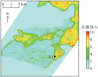 滩核微相是研究区的主力储集相带,滩缘次之,台洼和水道为非储层。因此,储层参数转换(相控孔隙度预测)仅针对滩核及滩缘微相进行。结合邻区测井资料岩石物理分析结果,在沉积微相(参见图 6)控制下,分别用不同公式对不同微相带进行孔隙度转换,预测储层孔隙度(图 9)。结果表明,研究区有利储层的分布范围较为局限,仅在北部和东部零星发育,范围小且不连片。预测结果与地质认识整体一致,孔隙度数值与研究区内唯一1口井的测井解释结果吻合,说明预测结果可靠。