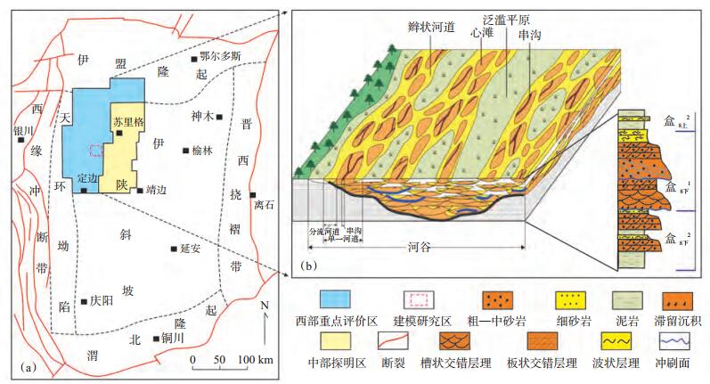 下载eps/tif图 图 1 苏里格气田研究区位置图(a)与辫状河沉积特征(b) Fig. 1 Location of the study area(a)and sedimentary characteristics of braided river(b)in Sulige Gas Field |