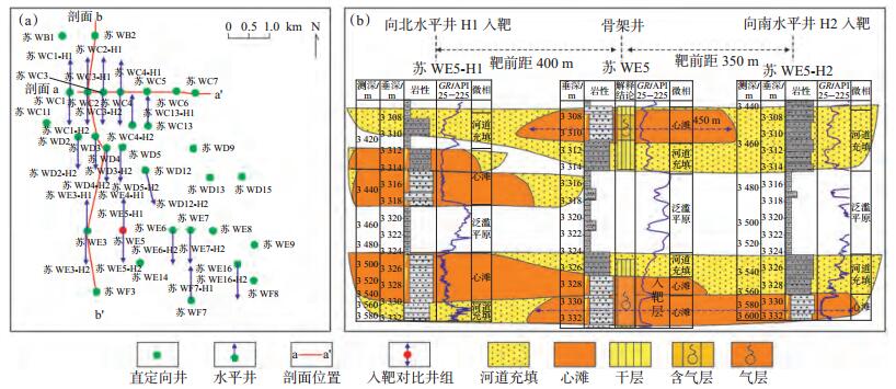 下载eps/tif图 图 2 建模工区井位图(a)与水平井入靶微相跟踪图(b) Fig. 2 Well position map(a)and microfacies contrast of horizontal wells(b) |