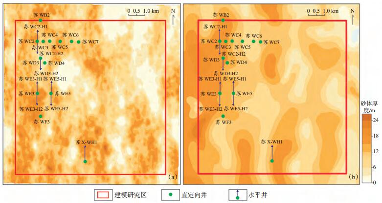 4.1 实钻井检验与模型验证苏里格气田苏X区块三维地质模型显示:西部砂带为有效砂体叠置有利区,东北部有效砂体“孤立”发育,这与实际钻井得到的认识一致,符合率高达82%;对利用三维地质模型得到的砂岩厚度图与人工分析勾画的砂体等厚图进行对比验证,前者与实钻结果符合率较高。运用三维地质模型通过地质知识库与多点统计学模拟对苏里格气田苏X区块井间砂体的规模与分布进行了合理地预测(图 5)。