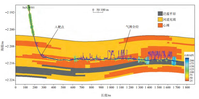 在三维地质模型单井验证高符合率与井间有效砂体高精度预测基础上,经过19口水平井的应用与验证分析,将苏X区块水平井有效储层钻遇率从平均40%提高到65%以上。例如:模型指导新钻水平井苏X-WH1,模型判定水平段为3个心滩叠置发育区,单个心滩长度为600~800 m。实钻GR值显示出长砂岩段(GR低值),仅有3个泥岩隔夹层段(GR高值),而其原因是由水平段轨迹钻遇心滩底部的相变所致。整体上三维地质模型心滩预测与水平井实钻结果相符合,有效储层钻遇率较高(图 6)。